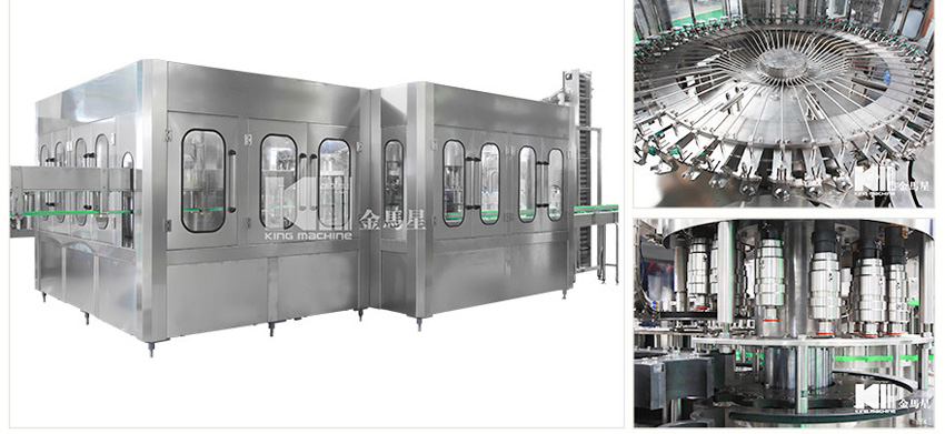 本设备主要用于含汽饮料灌装,包含冲瓶灌装和旋盖三大主要功能。本设备实现全自动运行,能够适应PET瓶含汽果汁、含汽矿泉水及可乐与雪碧等灌装。瓶型适应性强,更换瓶型时操作简单快捷。灌装方案中采用了等压灌装原理,灌装快速稳定,液位准确,含汽量足。与同类设备相比,本公司产品产量高,运行稳定安全,故障率低,自动化长度高,价格经济实惠。全机采用较好可编程控制器(PLC)来控制设备的自动运行,送瓶系统由变频器改变速度,更加稳定可靠。每个部分都有光电单元进行监测,所以更加自动化,操作更加便捷。在此基础上,更换灌装单元即可改变灌装模式到低压真空灌装和等压灌装等。本设备是饮料企业的理想选择。