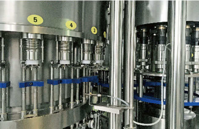 此设备主要应用于灌装饮料,包含冲瓶、灌装和旋盖三大功能。
