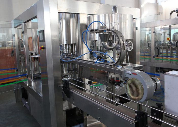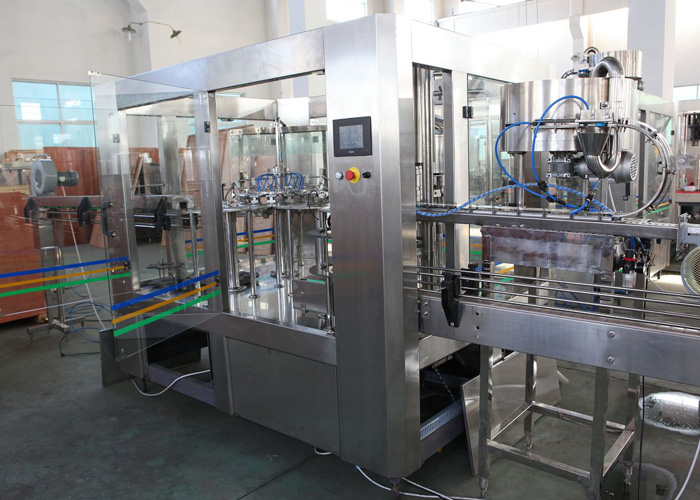 玻璃瓶灌装机集冲洗、灌装、旋盖于一体,全过程自动化运行,主要适用玻璃瓶矿泉水、玻璃瓶果汁、各种玻璃瓶酒类及各种玻璃瓶调味品等不含气产品的冲瓶、灌装、封口连续。本机大部分电器系统零件均采用国外较好产品,所有与液料接触的地方均采用优质的不锈钢材料制作,主关键部件采用数控机床精密加工, 整机光电检测各部件的运行状况,无瓶不灌装,无瓶不送盖,自动化程度高,操作简易,具有耐磨、稳定、故障率低等特点,产品质量处于行业前列,是新老饮料投资者的理想选择。