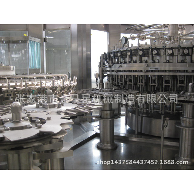 本设备主要用于含汽饮料灌装,包含冲瓶灌装和旋盖三大主要功能。本设备实现全自动运行,能够适应PET瓶含汽果汁、含汽矿泉水及可乐与雪碧等灌装。瓶型适应性强,更换瓶型时操作简单快捷。灌装方案中采用了等压灌装原理,灌装快速稳定,液位准确,含汽量足。与同类设备相比,本公司产品产量高,运行稳定安全,故障率低,自动化长度高,价格经济实惠。全机采用较好可编程控制器(PLC)来控制设备的自动运行,送瓶系统由变频器改变速度,更加稳定可靠。每个部分都有光电单元进行监测,所以更加自动化,操作更加便捷。在此基础上,更换灌装单元即可改变灌装模式到低压真空灌装和等压灌装等。本设备是饮料企业的理想选择。