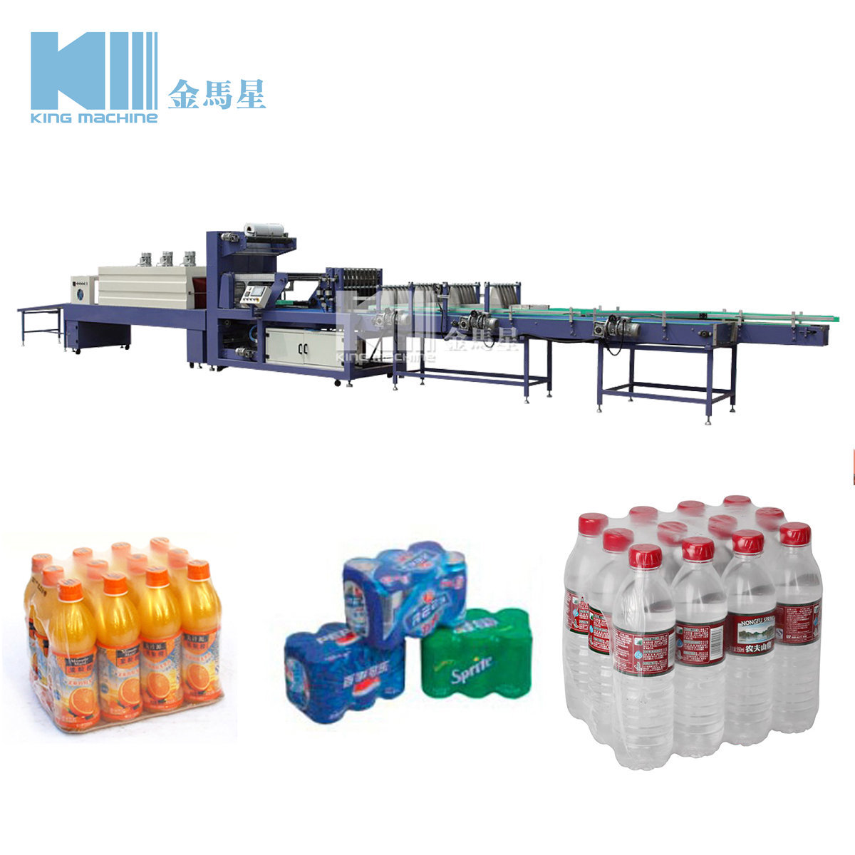 此设备专用于瓶装水的高速包装。当瓶子到位之后,此设备自动环绕包装,大大提高了工作效率。PLC控制,自动运行。恒温收缩,表面涂有特氟龙,稳定密封。触摸屏带来易操作的保证。适应各种瓶型和无托盘的包装。
